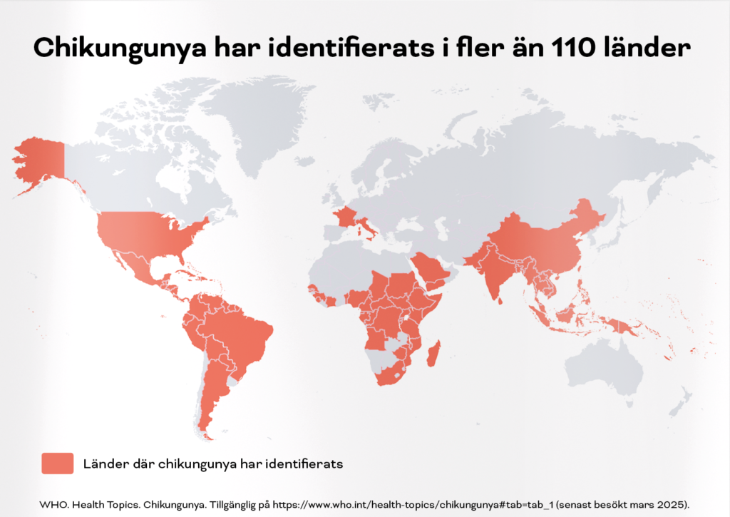 Chikungunya har identifierats i 110 länder och historiskt sett framför allt rapporterats i Afrika och Asien. Under senare år har viruset dock fått ökad spridning även i andra delar av världen.[iii]